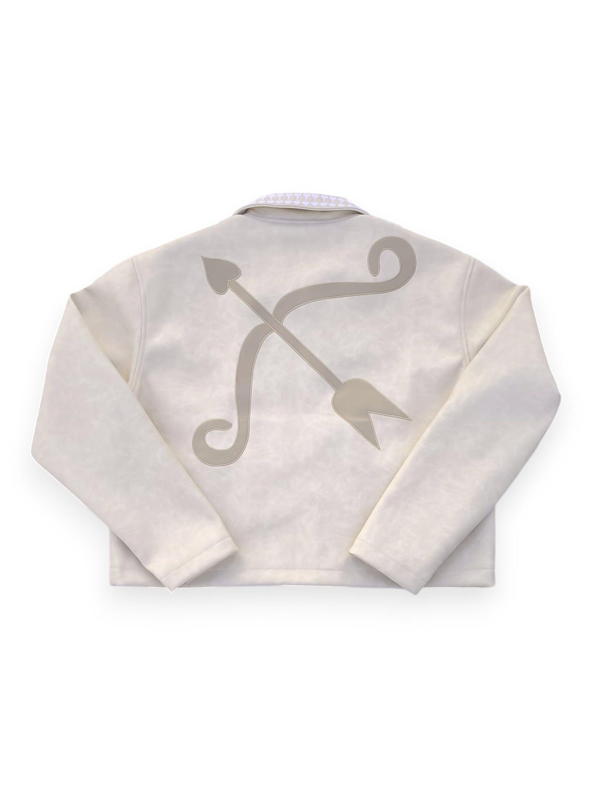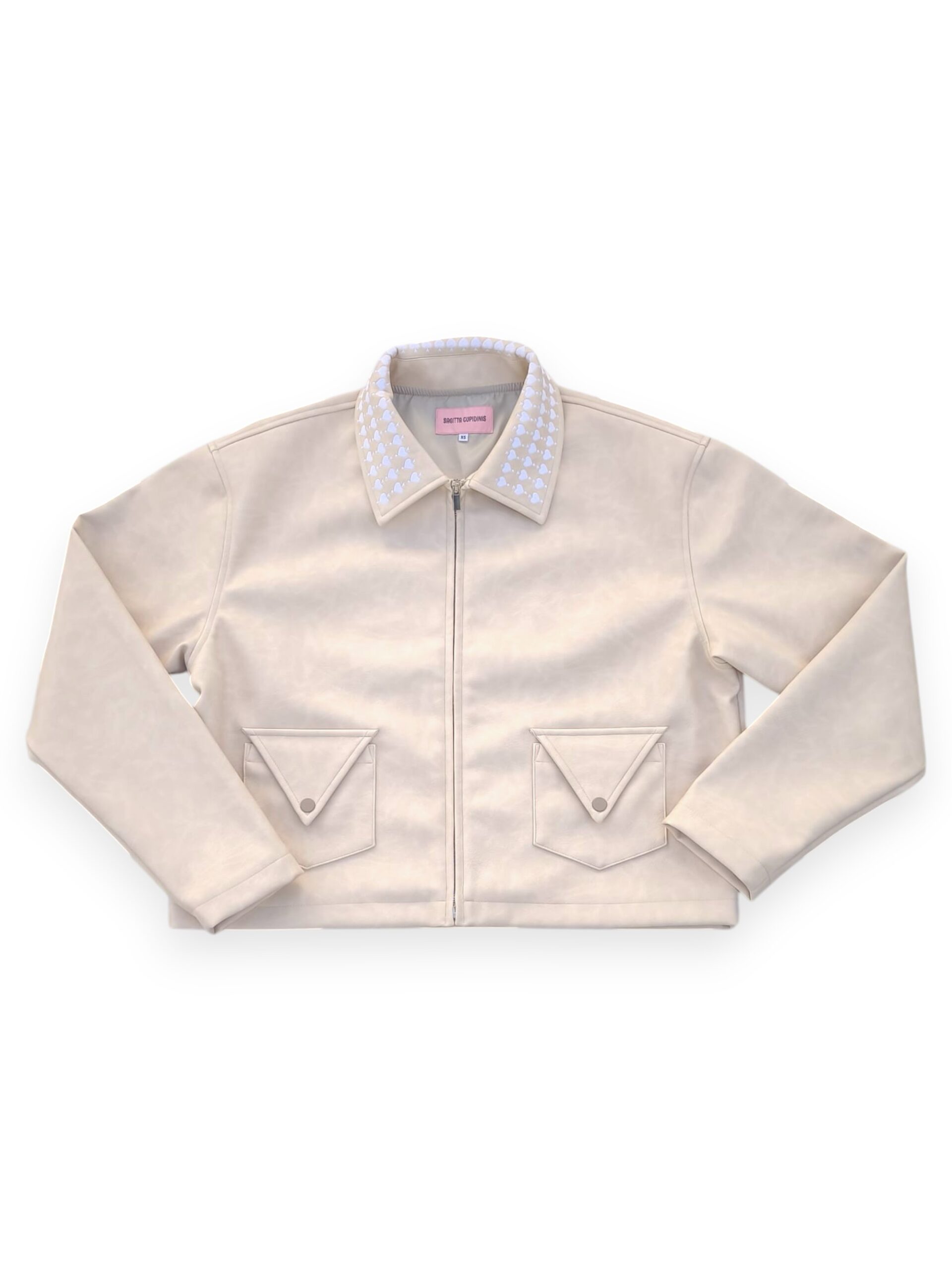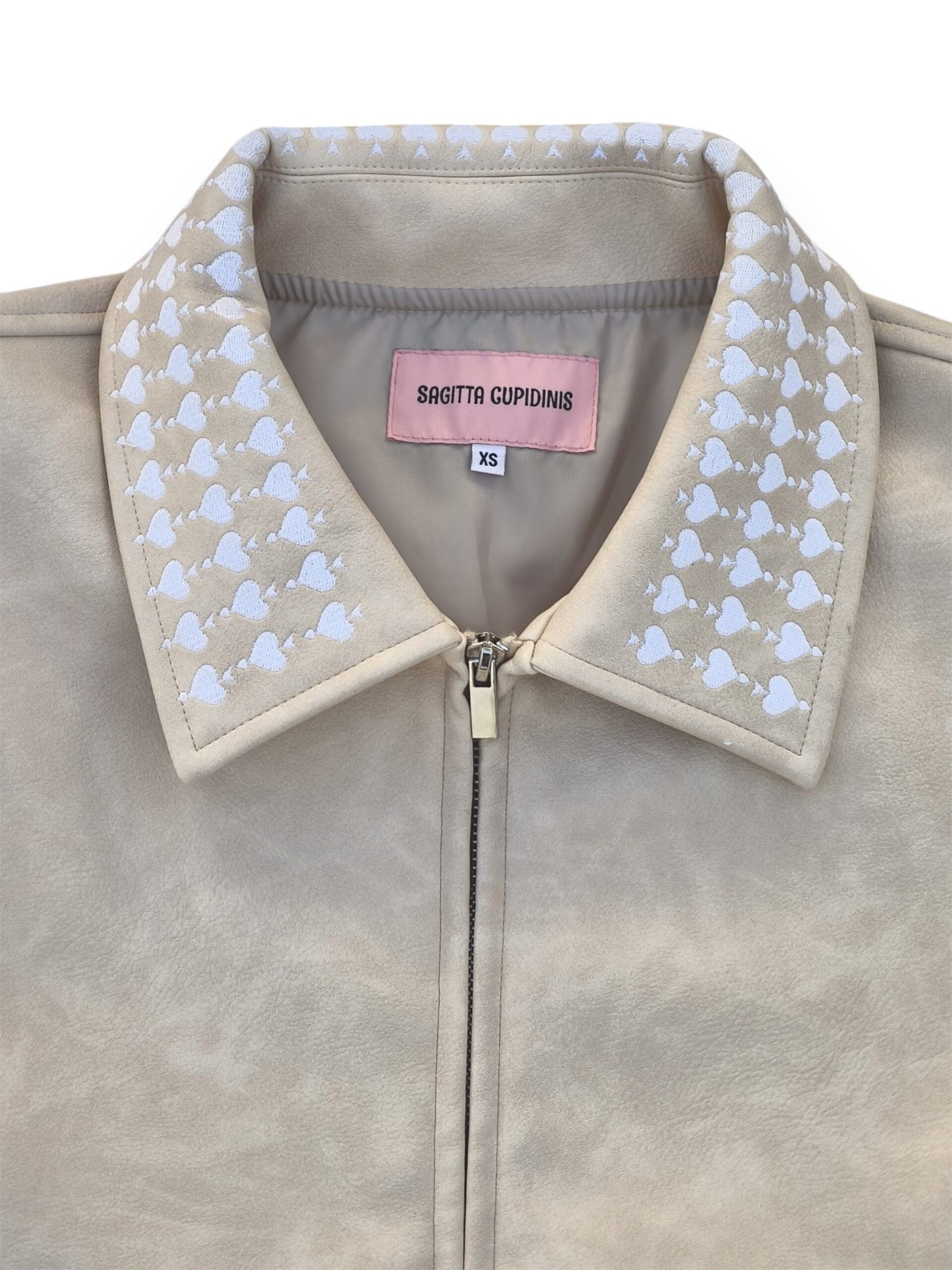 Beige leather relaxed fit jacket, featuring stitched white hearts on the collar and a leather patch of a bow and arrow on the back. Inner lining in soft polyester for comfort.