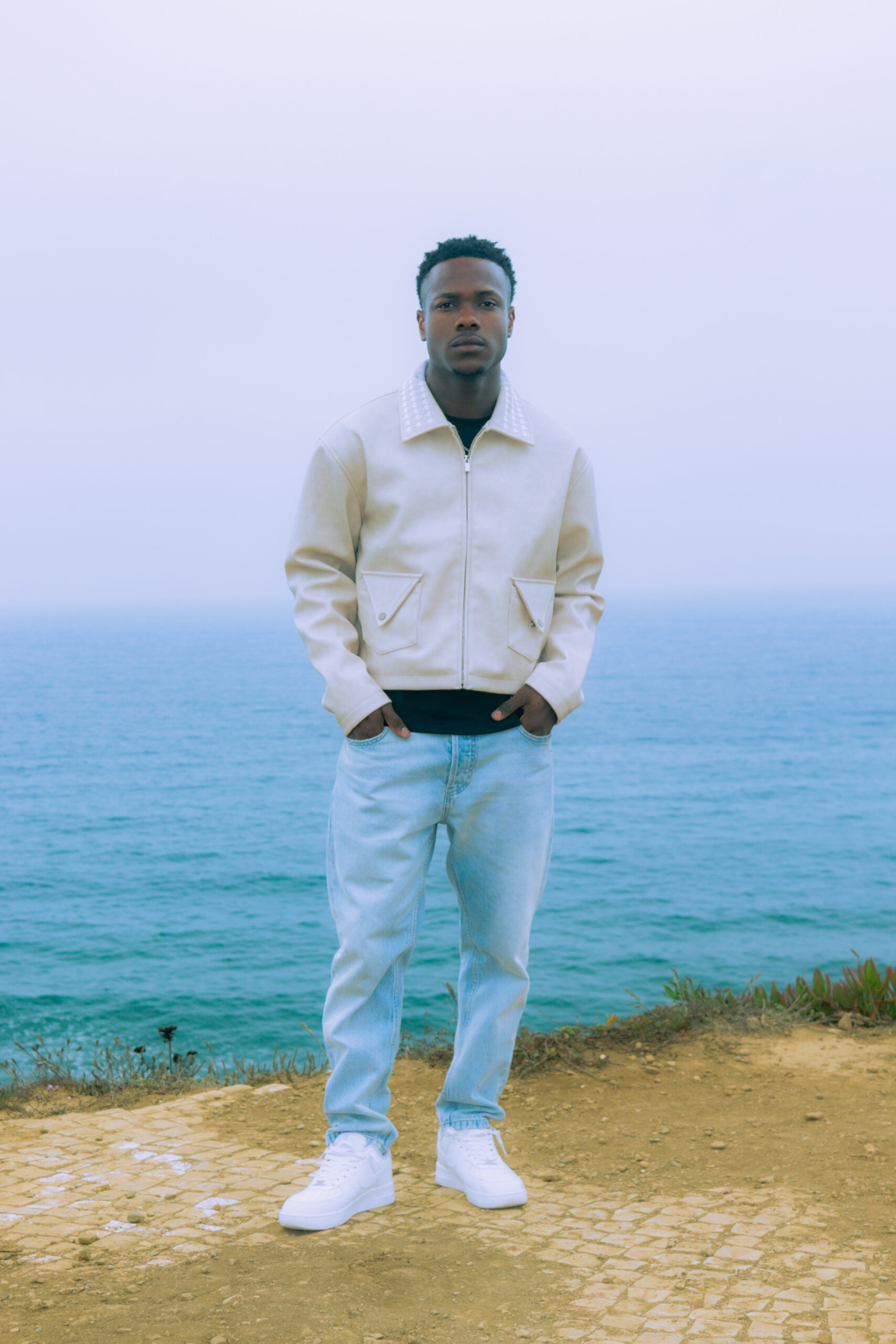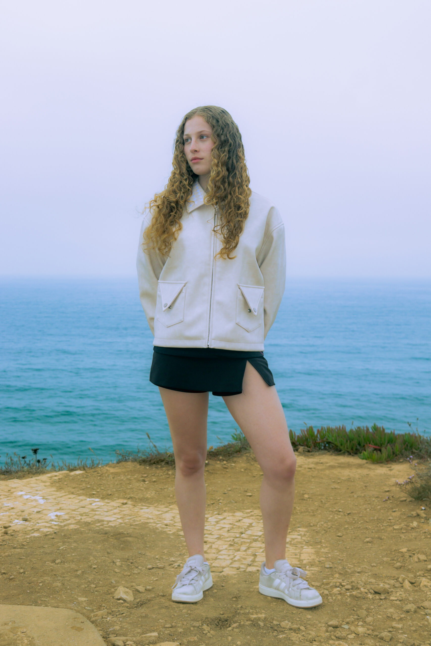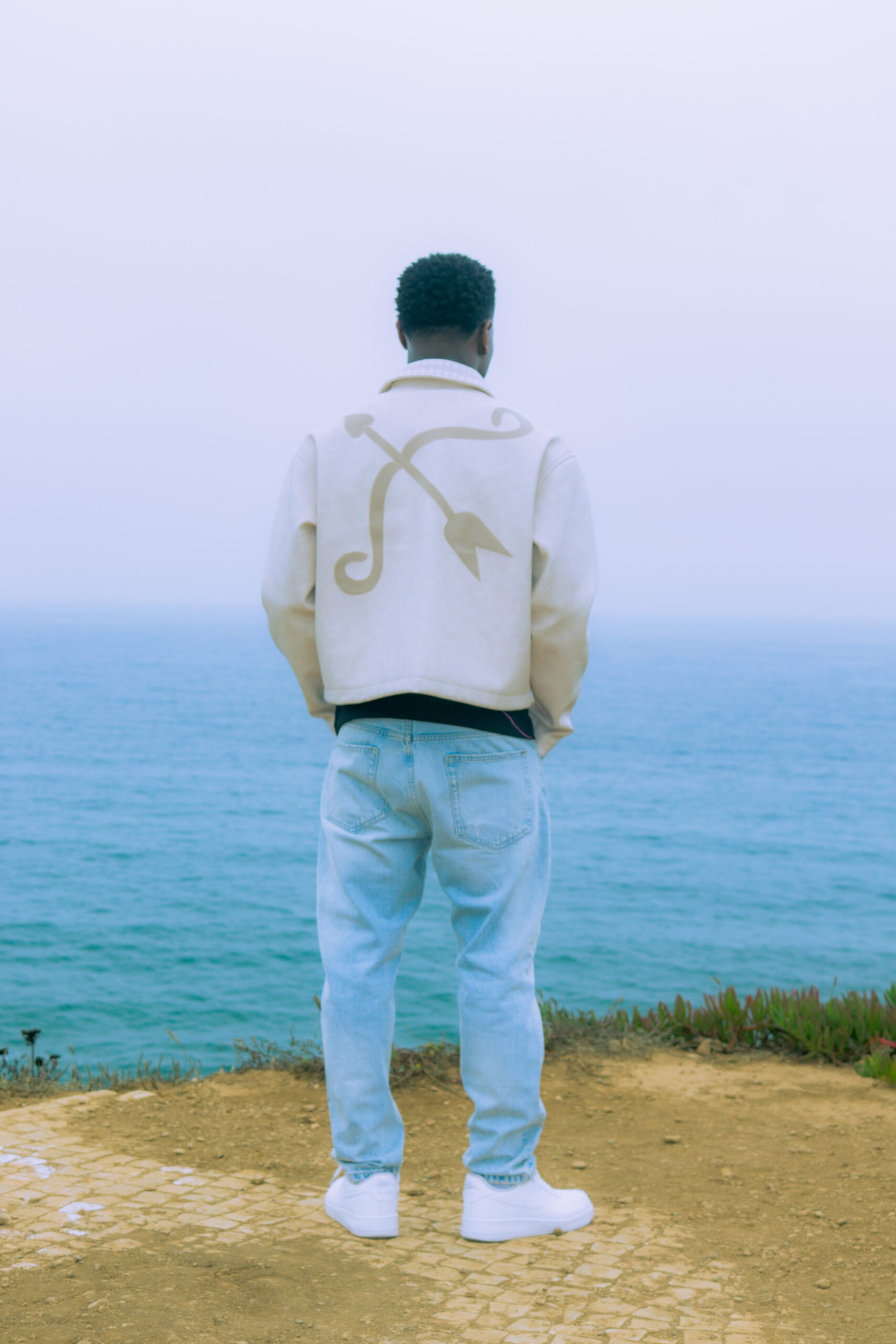 Beige leather relaxed fit jacket, featuring stitched white hearts on the collar and a leather patch of a bow and arrow on the back. Inner lining in soft polyester for comfort.